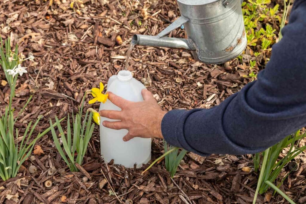 • Fill a plastic bottle with water, make small holes in the cap or bottom, and invert it into the soil.