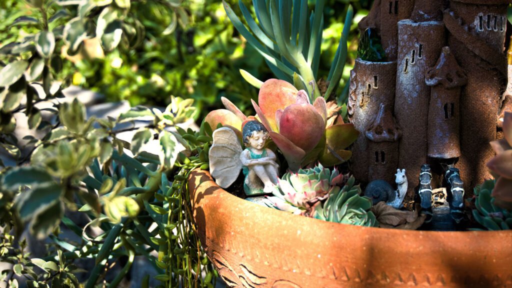A fairy garden is essentially a small-scale landscape designed to mimic a magical outdoor environment. Traditionally, these gardens feature: