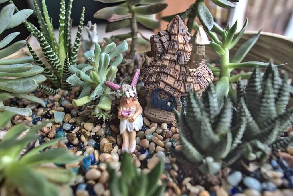 - Decorative elements like pebbles, fairy figurines, and fairy lights.