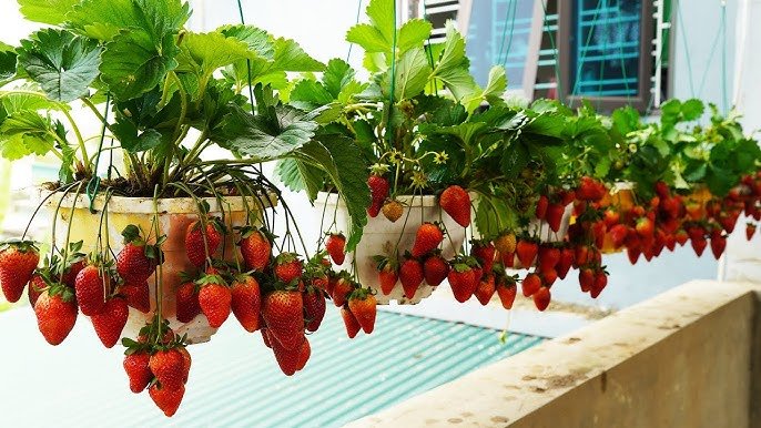 Hanging strawberries not only produce fruit but also enhance visual appeal: