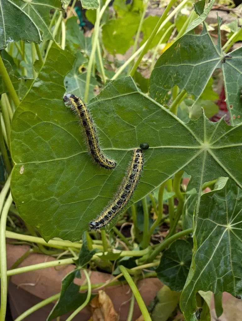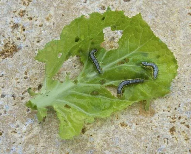 - Appearance: Velvety green caterpillars with faint yellow stripes. They are larvae of the small white butterfly often seen fluttering around brassicas.